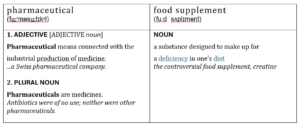 According to the Collins Dictionary, the definitions of “Food Supplements” and “Pharmaceuticals” are as follows: