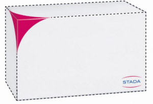 This example is actually a cloned UK registration from an EUIPO registration upon Brexit and refers more to a “position” mark than a straightforward 3D shape. The mark does include the brand name “STADA”, but the dotted lines indicate that the only element that STADA seek to register is the pink corner element on the left together with the STADA logo on the right.