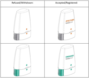 Whilst the images on the left include a design image, there is no brand name, and the applications appear to have received objections from the Registry and were subsequently withdrawn by Novartis. The same device, but filed with the brand name included, were accepted for registration.