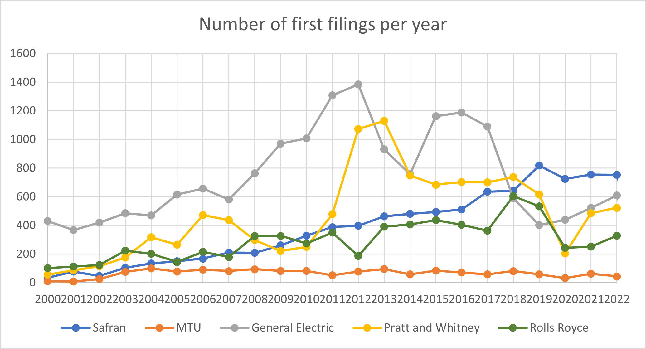 Die P&W-Daten für 2020 sind mit ziemlicher Sicherheit zu niedrig angesetzt. Die Fusion des Mutterkonzerns UTC mit Raytheon in diesem Jahr führte zu Unsicherheiten bei den Daten, sodass die etwa 200 Anmeldungen als Minimum betrachtet werden sollten. Das Bild für die Jahre ab 2021 ist jedoch klarer, da einige Anmeldungen, die zuvor im Namen von P&W eingereicht worden wären, nun offenbar mit Raytheon als Antragsteller eingereicht werden. Wir haben versucht, alle derartigen relevanten Anmeldungen in den Daten ab 2021 zu erfassen. Die Anmeldezahlen in den Jahren 2021 und 2022 deuten darauf hin, dass die Fusion mit Raytheon keine grundlegende Änderung im Ansatz zum Innovationsschutz bewirkt hat, aber ein leichter Aufwärtstrend ist erkennbar.