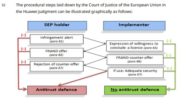 In einem Amicus-Curiae-Schriftsatz der Europäischen Kommission (EK) in einem deutschen Verfahren zwischen HMD und VoiceAge wurde vorgeschlagen, dass die Abfolge der Verfahrensschritte gemäß Huawei v. ZTE in einer starren Reihenfolge eingehalten werden muss, wenn der SEP-Inhaber eine einstweilige Verfügung erwirken möchte, ohne gegen das EU-Wettbewerbsrecht zu verstoßen. Die Schritte, wie unten grafisch dargestellt, umfassen einen ersten Schritt, bei dem der SEP-Inhaber einen Implementierer über eine Verletzung informiert, und einen zweiten Schritt, bei dem der Implementierer seine Lizenzbereitschaft zum Ausdruck bringt. Der Amicus-Curiae-Schriftsatz vertrat auch eine strenge Auffassung vom Inhalt der Verletzungsmitteilung, indem er vorschlug, dass ein Verweis auf eine Webseite eines Implementierers nicht ausreiche und dass detaillierte Informationen wie eine Anspruchstabelle des EP-Patents in der Verletzungsmitteilung enthalten sein sollten.