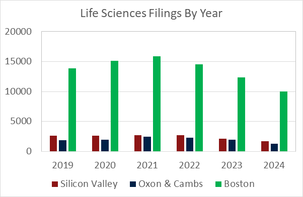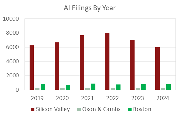 Es kommt relativ selten vor, dass die Welten der Politik und des geistigen Eigentums (IP) aufeinanderprallen. IP und insbesondere Patentanmeldungen werden jedoch häufig als Barometer für Innovation verwendet. Um die Ambitionen der Finanzministerin grob und schnell einschätzen zu können, haben wir untersucht, wie viele Patente für künstliche Intelligenz (KI) und Biowissenschaften (LS) von Antragstellern in Innovationszentren in Oxfordshire und Cambridgeshire angemeldet wurden, und diese Zahlen mit den im Silicon Valley und im Boston Cluster angemeldeten Zahlen verglichen.