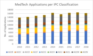 Medical technology can be divided according to the patent classifications listed in the table below. The following bar chart shows that classifications A61B, A61F and A61M were the top three areas for MedTech applications from 2010-2018.