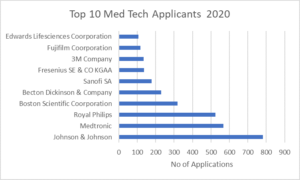 There were some standout performers in the MedTech field. Johnson & Johnson was the top applicant in the MedTech sector with 781 applications overall in 2020. In second place was Medtronic with 567 applications followed by Royal Philips with 524 applications. It is also worth pointing out that Johnson & Johnson also had the 3rd highest number of patent applications in the pharmaceutical field in 2020.