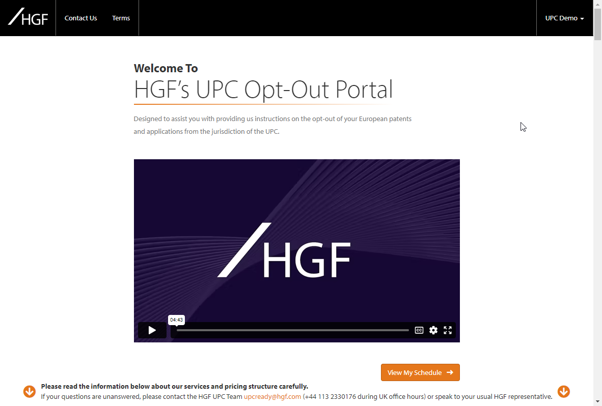 HGF’s bespoke UPC Opt-out portal has been designed and developed by HGF to assist clients when providing us with their instructions on the opt-out of their European patents and applications. The portal sits within HGF’s online client information portal, OCIS. Each client has a unique and secure login which provides access to their company patent schedule for all patent cases that are eligible for the UPC opt-out. The portal enables clients to review and submit information to HGF in order for us to file an opt-out application on our client’s behalf, creating a streamlined process. The portal also provides real-time access on the decisions you have made on your opt-out history and is accessible 24/7.